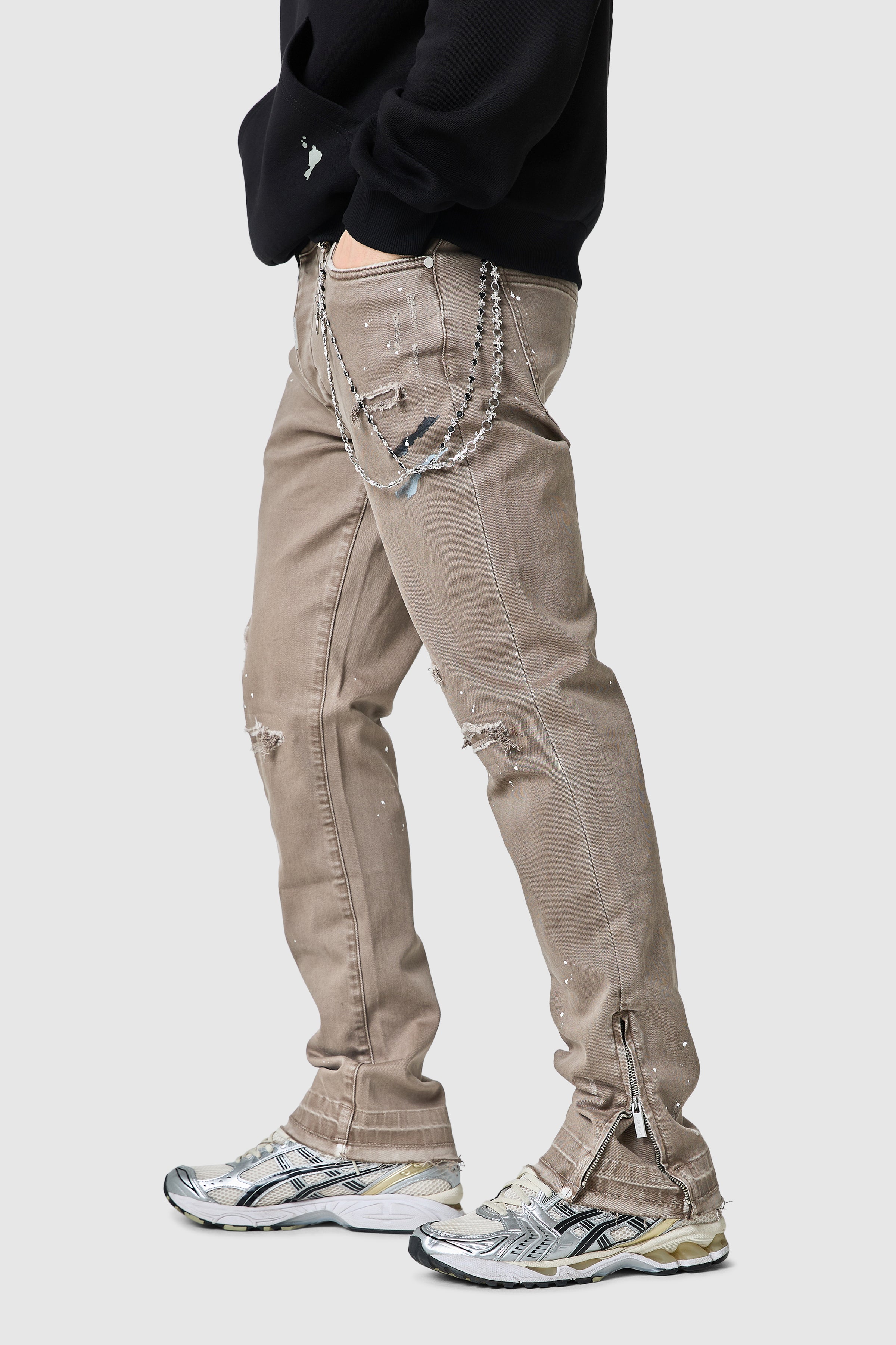 A slim stacked silhouette with elevated edge. Crafted from premium denim in a muted taupe wash, these jeans feature distressed detailing, subtle paint splatter accents and ankle zip finishes for adjustable stacking.