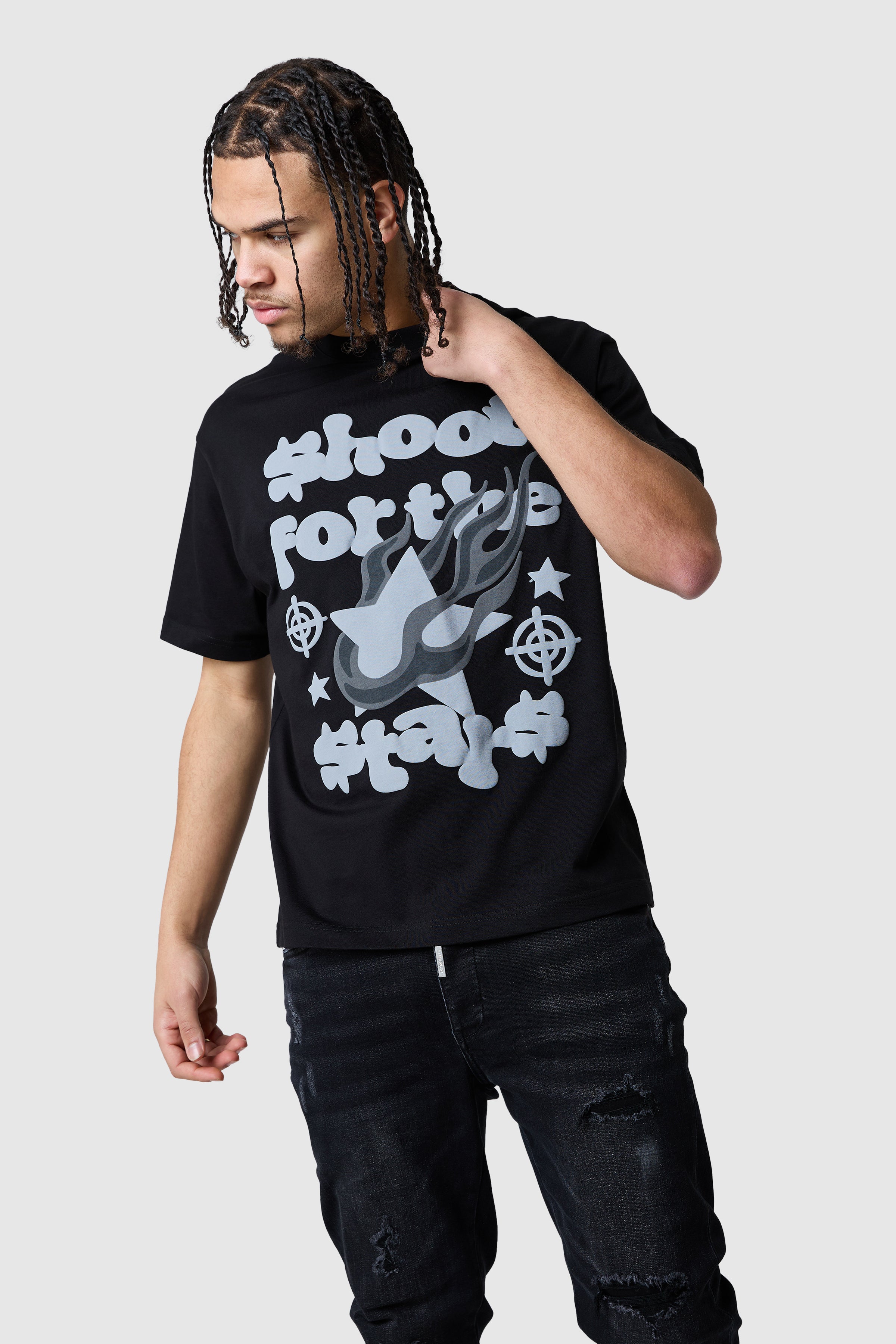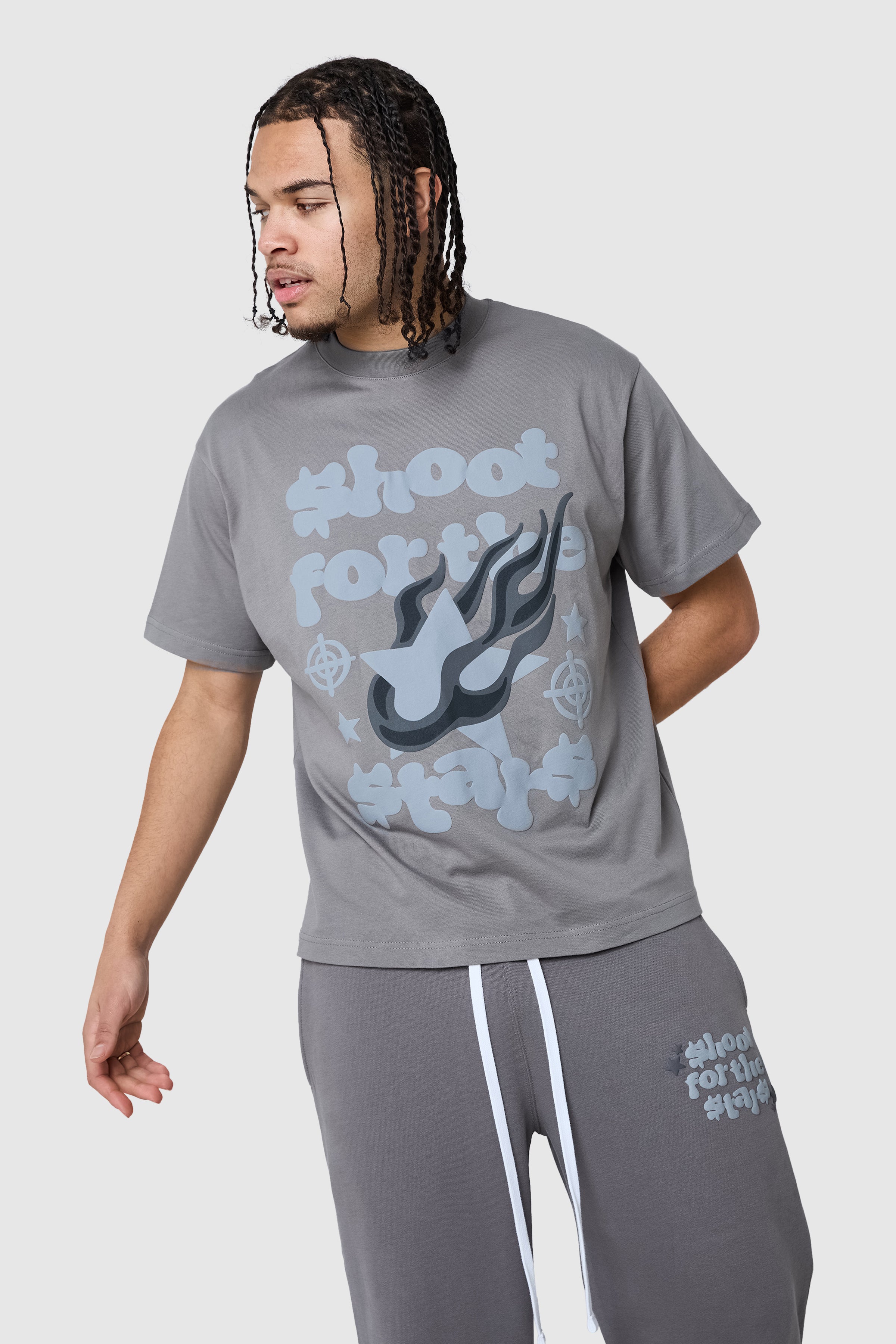 A relaxed, graphic tee designed for everyday style. The Target Tee in Steel is crafted from 100% cotton jersey for a soft, structured feel, featuring a drop shoulder silhouette and a bold puff print graphic on the front for a statement finish.