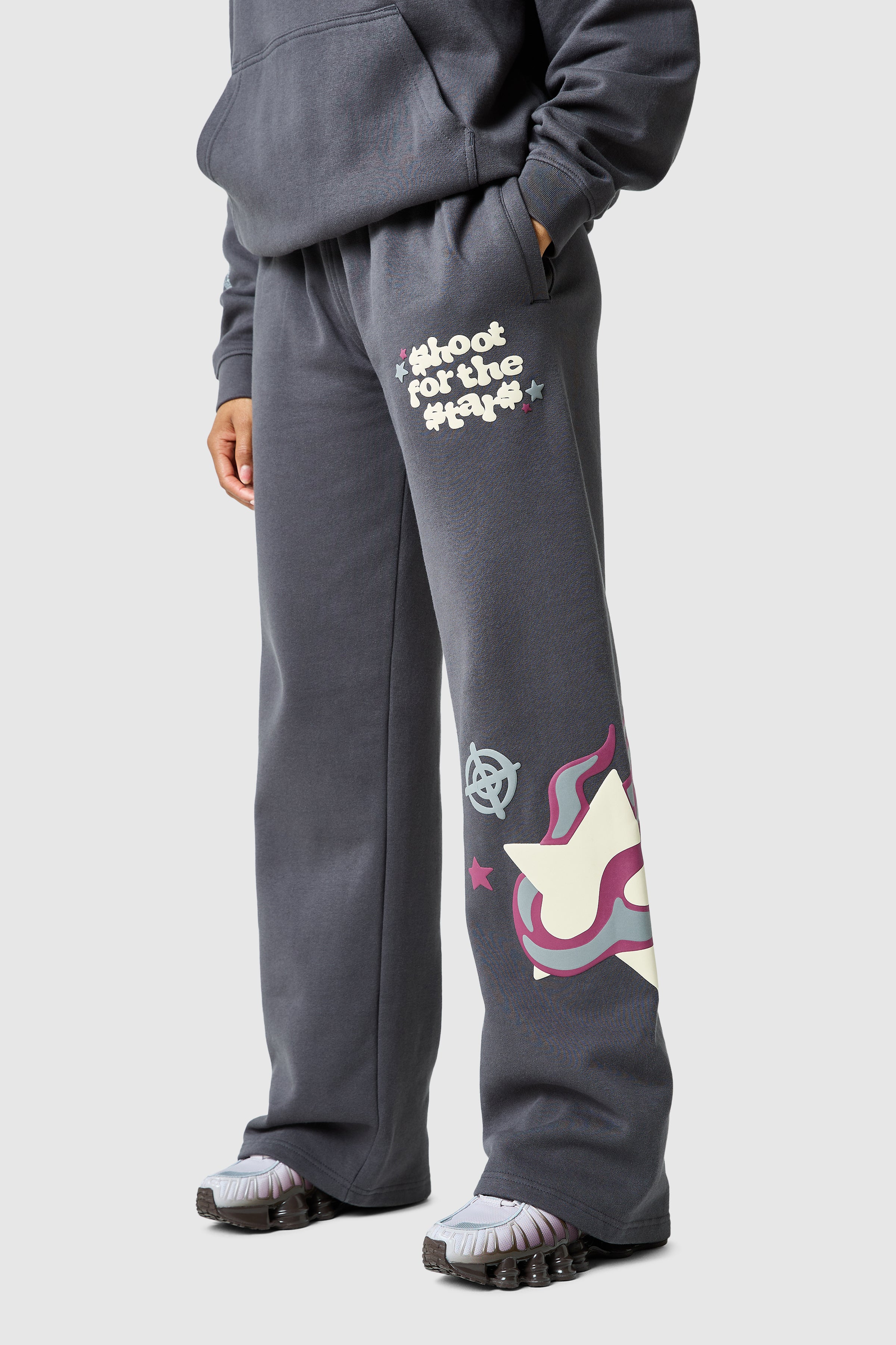 Introducing the Shoot For The Stars Tracksuit. Featuring a bold graphic puff print and ribbed cuffs and hem hood and a wide leg jogger, Shoot for the Stars is a new staple.